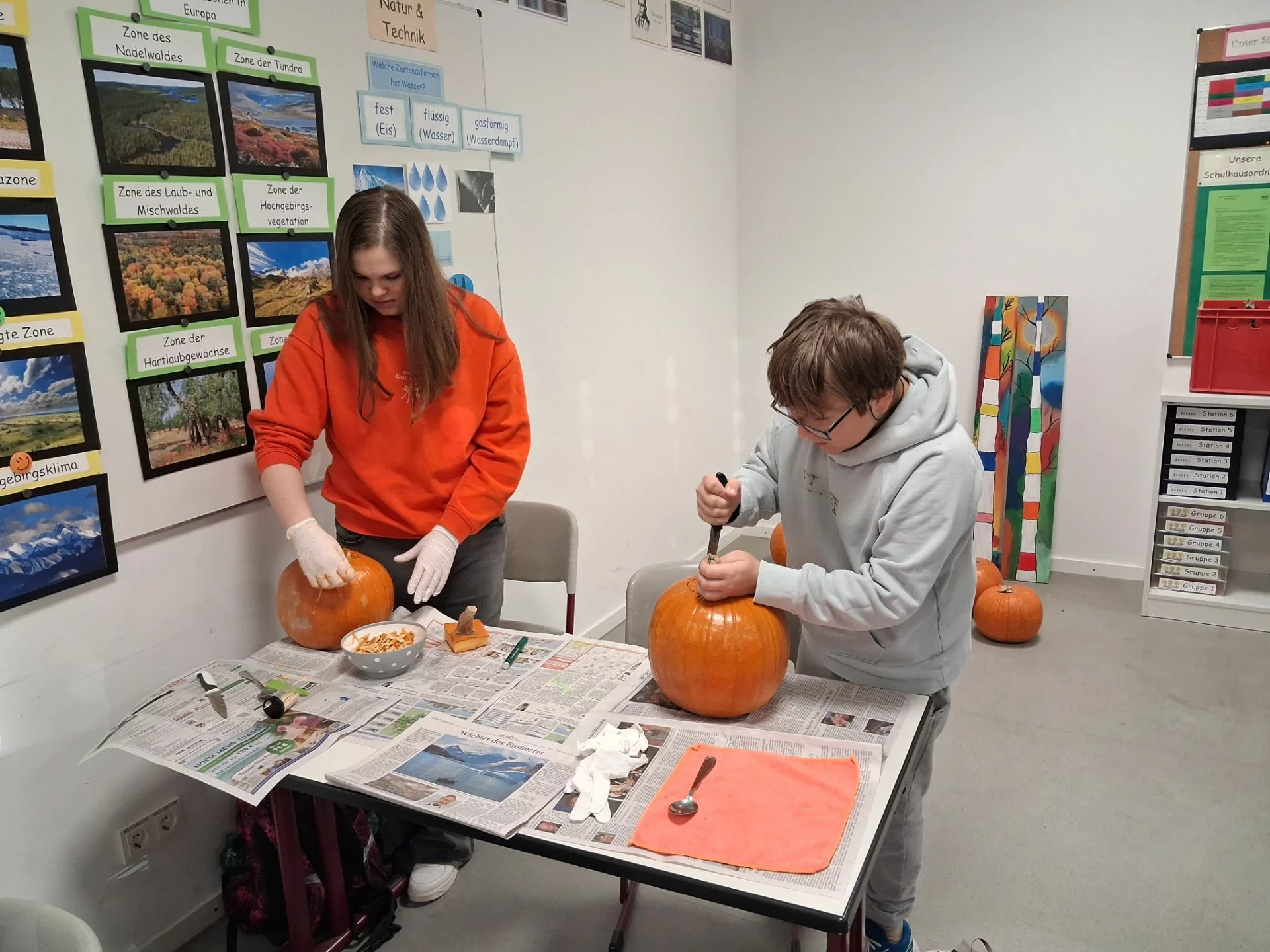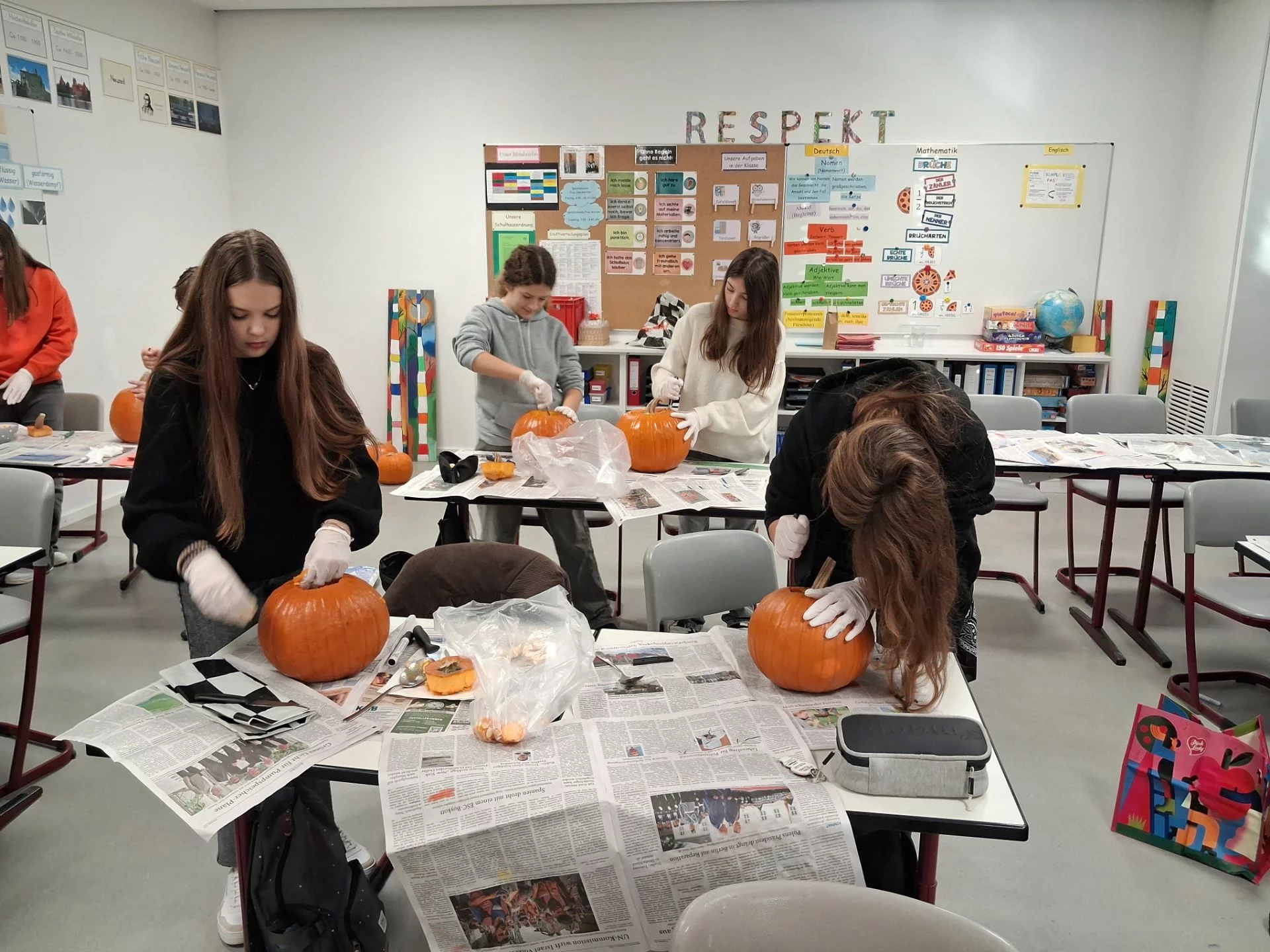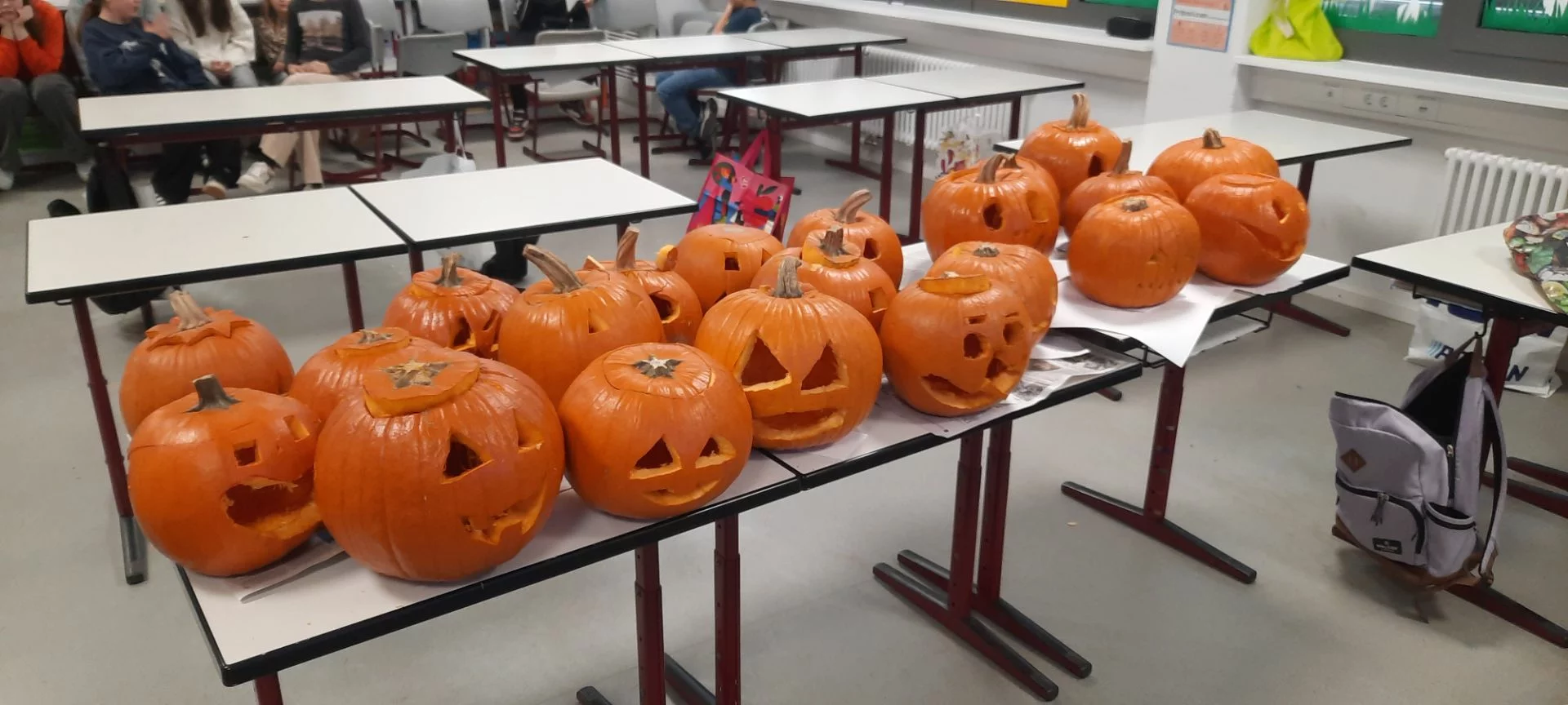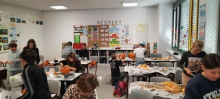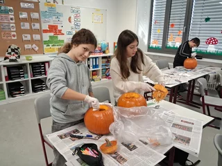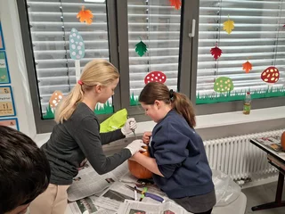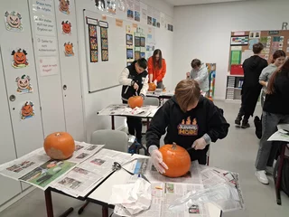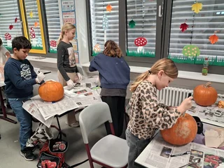 Welcher Kürbis hat das gruseligste Gesicht? Unter diesem Motto stand am 31.10.2025 der Schulvormittag in der Klasse 6a. Unter Anleitung von Frau Wurzer, Frau Tanzer und Herrn Sibler schnitzten die Schülerinnen und Schüler ihren eigenen Halloweenkürbis. Zunächst wurde der Deckel abgeschnitten. Danach entfernten die Kinder das Fruchtfleisch des Kürbisses. Im Anschluss daran wurde das Gesicht mit Hilfe von Vorlagen auf den Kürbis gezeichnet und schließlich mit einem Obstmesser herausgeschnitten. Die so entstandenen Gruselkürbisse konnten sich wirklich sehen lassen und jagten bestimmt dem einen oder anderem Besucher an der Haustüre am Abend einen kleinen Schrecken ein.