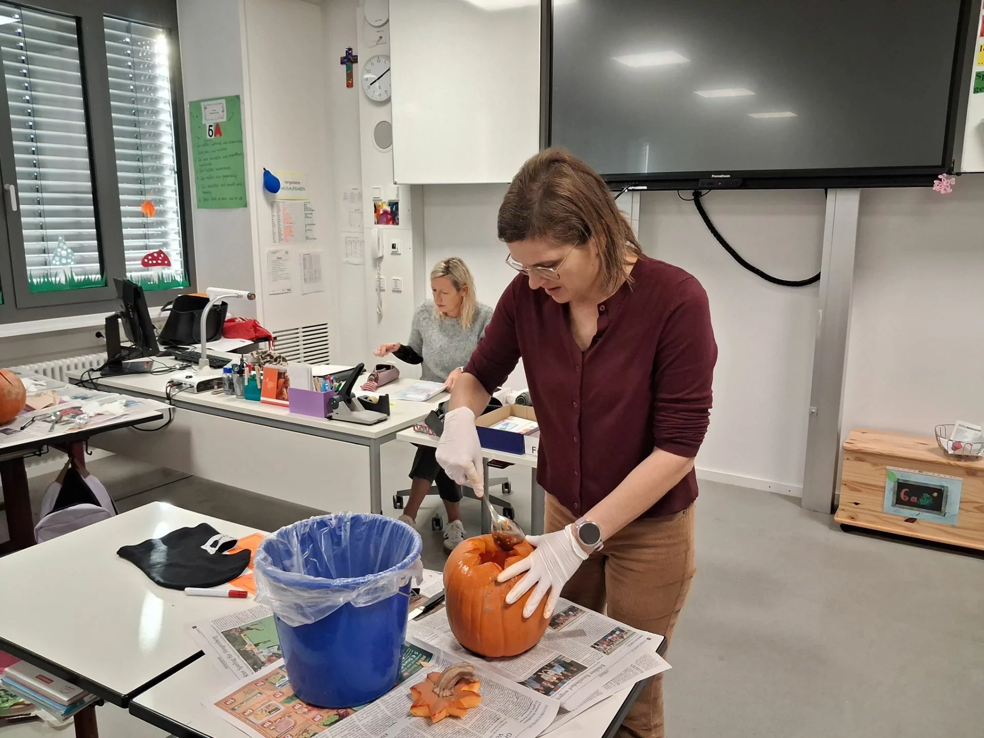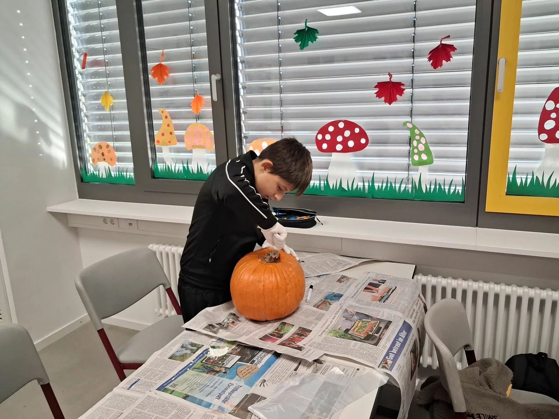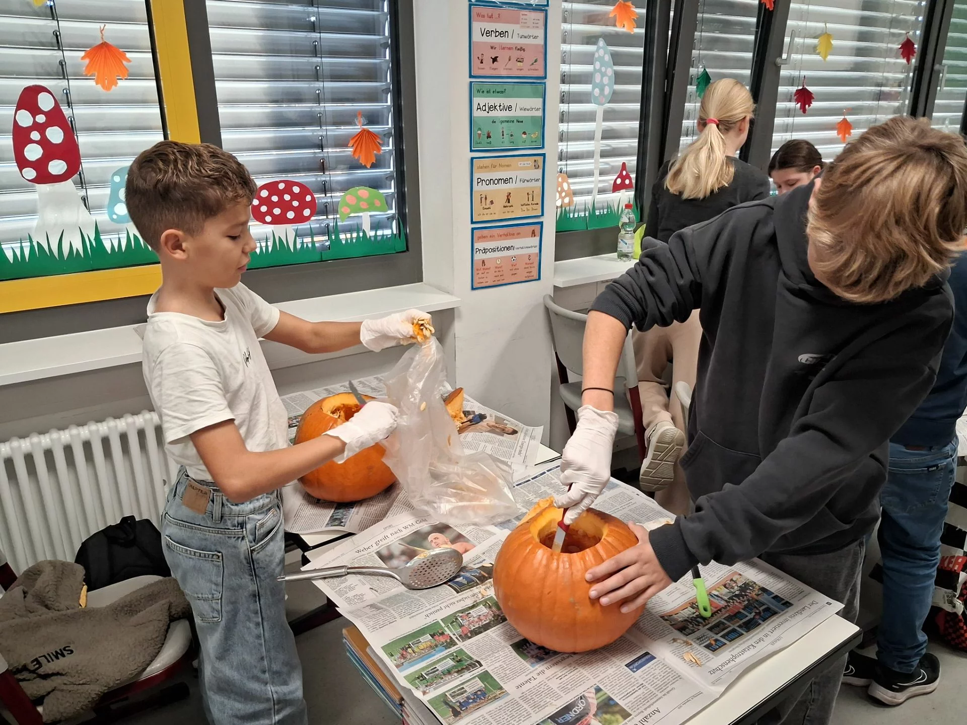 Welcher Kürbis hat das gruseligste Gesicht? Unter diesem Motto stand am 31.10.2025 der Schulvormittag in der Klasse 6a. Unter Anleitung von Frau Wurzer, Frau Tanzer und Herrn Sibler schnitzten die Schülerinnen und Schüler ihren eigenen Halloweenkürbis. Zunächst wurde der Deckel abgeschnitten. Danach entfernten die Kinder das Fruchtfleisch des Kürbisses. Im Anschluss daran wurde das Gesicht mit Hilfe von Vorlagen auf den Kürbis gezeichnet und schließlich mit einem Obstmesser herausgeschnitten. Die so entstandenen Gruselkürbisse konnten sich wirklich sehen lassen und jagten bestimmt dem einen oder anderem Besucher an der Haustüre am Abend einen kleinen Schrecken ein.