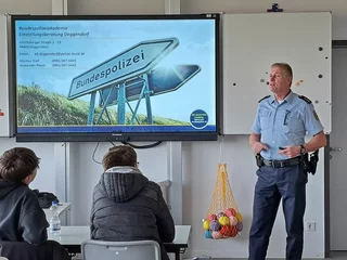 Am 31.10.2025 kamen zwei Vertreter der Bundespolizei an die Isar-Mittelschule, um die kommen-den Absolventen der Mittleren Reife über eine Karriere als Ordnungshüter zu informieren.