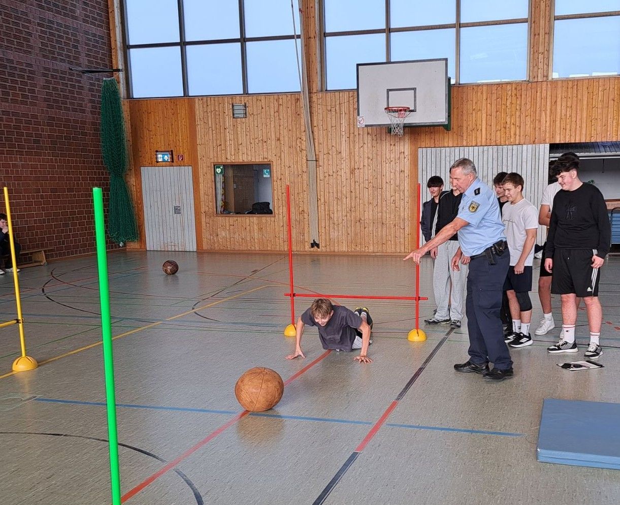 Anschließend durften sich die Schüler unter Leitung von Herrn Alexander Poost in der Turnhalle noch an verschiedenen Sporttests versuchen, die die Kandidaten bei der Bewerbung erwarten. Schon beim Aufwärmen kamen sie dabei mächtig ins Schwitzen. Der Hindernisparcours und der Pendellauf brachten den ein oder anderen schon an seine Grenze. „Beim Sporttest wird einem einiges abverlangt, das ist beileibe kein Selbstläufer!“, fand Benny, der fest entschlossen ist, sich zeitnah zu bewerben.