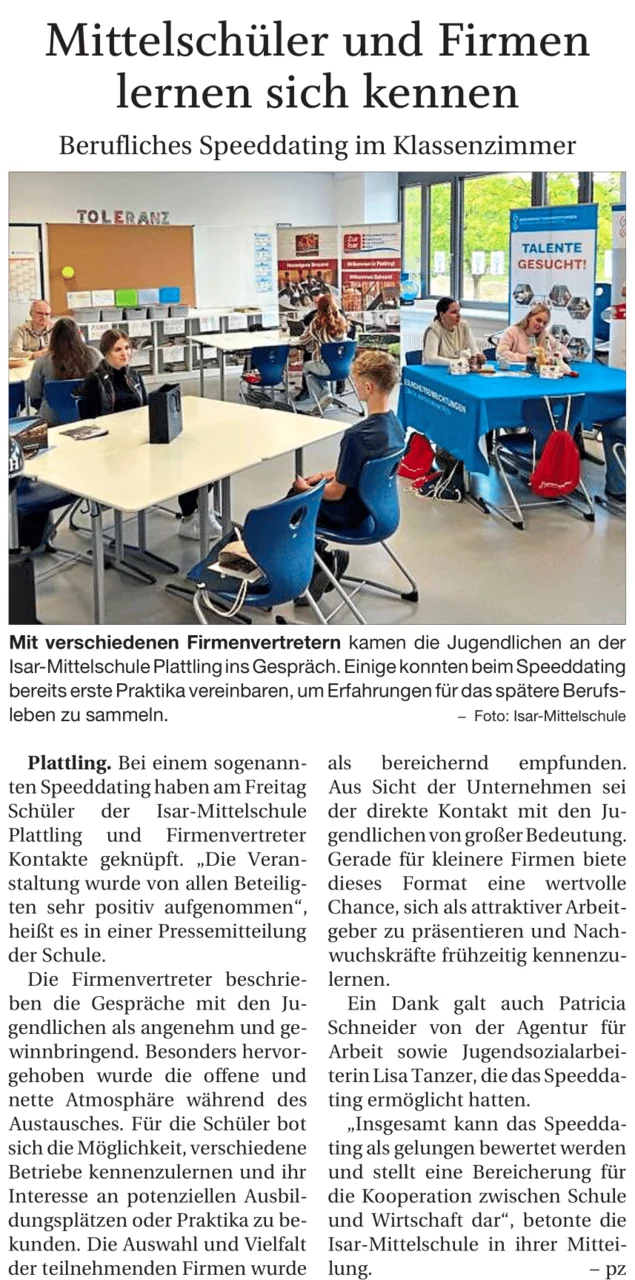 Am Freitag, den 26. September 2025, fand für die Abschlussklassen an der Mittelschule Plattling ein sogenanntes Speeddating statt. Dabei kamen viele namhafte Betriebe und deren Vertreter aus dem Landkreis zu uns in die Schule. Sie hatten die Aufgabe, ihren Betrieb oder die schulische Einrichtung vorzustellen und uns Schüler die Möglichkeit zu geben, Fragen zu stellen und mit ihnen ins Gespräch zu kommen.