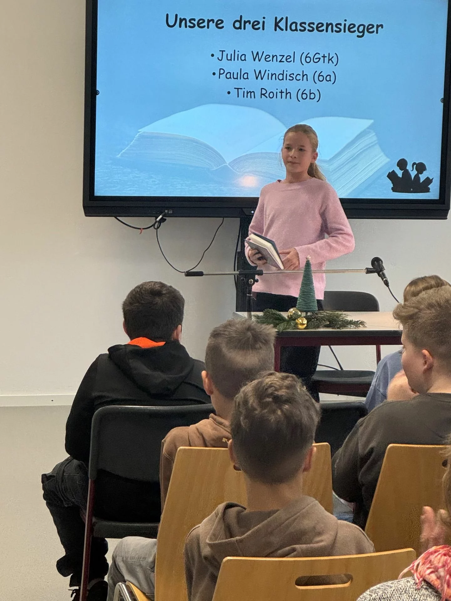 Die Erwartungen der anwesenden Gäste an die Lesekünste der drei Klassensieger waren hoch, doch die Schülerinnen und Schüler der drei 6. Klassen zeigten bereits zu Beginn großes Engagement und eine spürbare Freude am Lesen.